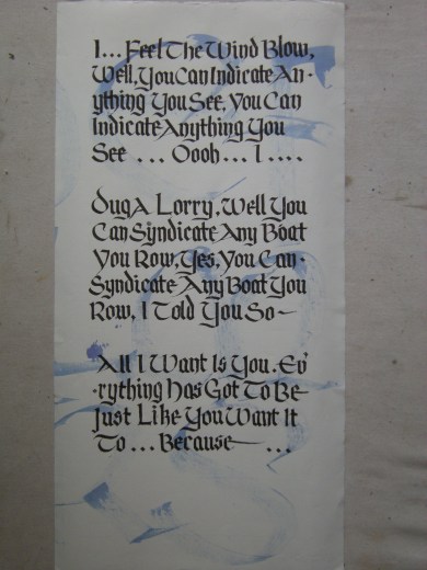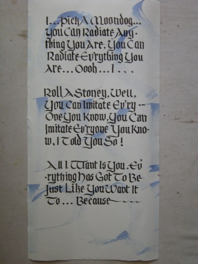 A clever way to learn the words to a song. Too bad, I still have to look at the lyrics when I sing it! But a really fun project. A very large piece–14×26 each panel. A wedding gift.