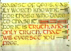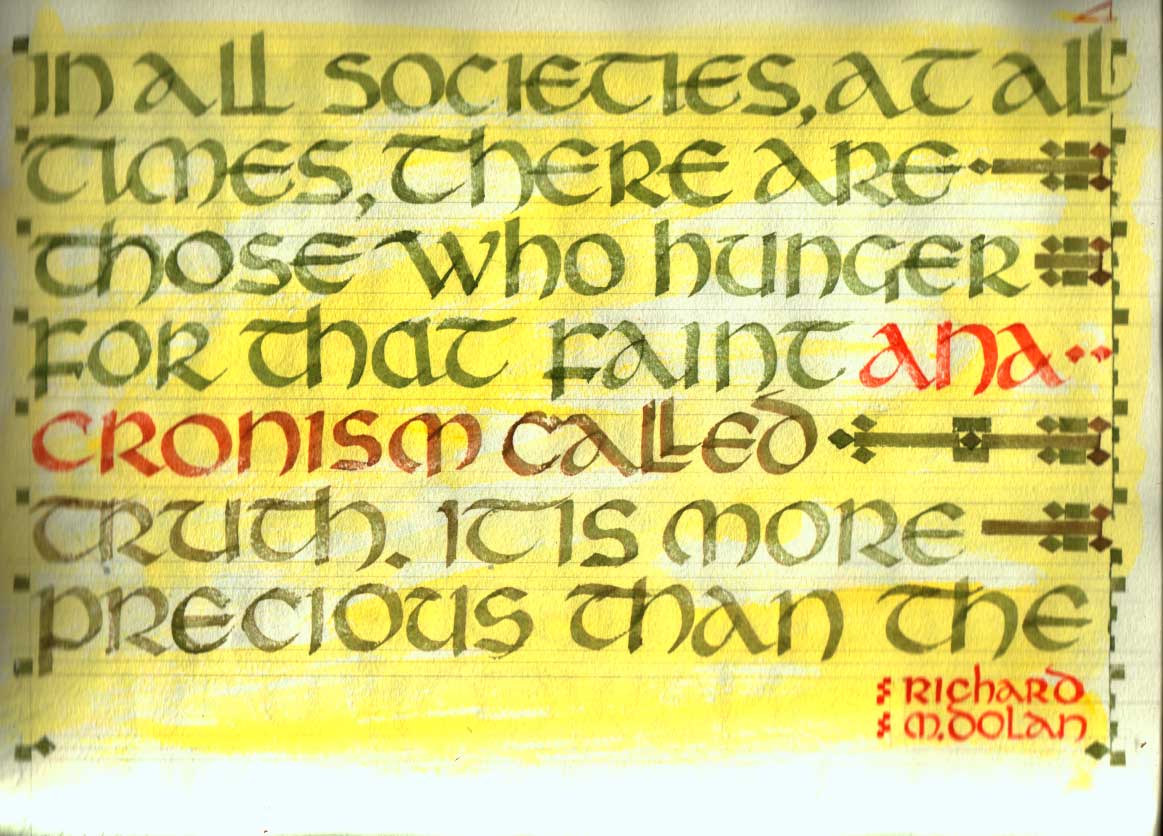 Spring 2011. A few pieces in UNCIAL hand, courtesy of a week of terrible weather (for gardening) This piece is too big for my scanner–but not a bad likeness.