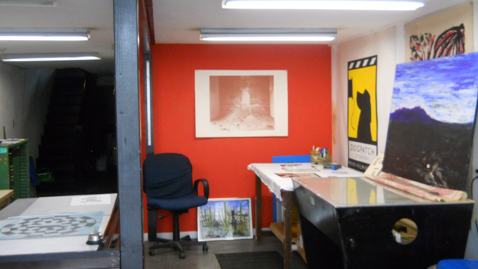 Here is the miraculous Red Wall Ann painted for me at the shop. ‘nuf said, it makes everything so much more alive. The landscape on the light table is my painting of the Mesquite Springs Campground (Death Valley) conflated with a Phainopepla–a bird native to Southern Arizona.