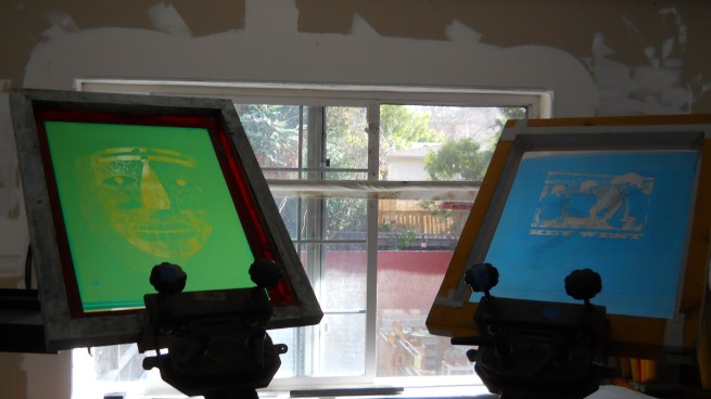 I made several screens of found images that I haven’t fully utilized. I enlarged a bubblegum card photo of The Beatles in Key West and lettering composed to fit, hope to make a t-shirt as a Christmas gift. Plus some of my own pen-and-ink drawings from college, when I did such things. Screens ok, prints, not so much clear sometimes on what I want to do with them. This mask from a drawing I did in 1985 turned out to be Steve’s favorite shirt.