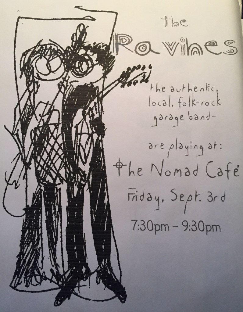 Somehow, another misspellable name on a marquee lead to a name change, and then we were the Ravines, with a key board player, and eventually another drummer. But that’s all written up elsewhere, perhaps.