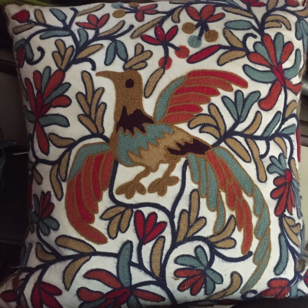 He slept and napped, I puttered in the RH and did his laundry and camped in my van, OMG I could hardly get the pop-top up, it has been so long. I am so at home here, the things I thought I had lost forever, my parking space, my studio, all is as it was when I left in abject misery. Who else knows his habits, his quirky home and proclivities? Only I. On the way here I saw a free box and picked out a pillow for Westy, immaculate white, with a bird embroidered in navy, burnt orange, teal, ochre, a Bird of Paradise, a Phoenix, a rebirth. If only for now. Yes, so mote it be.