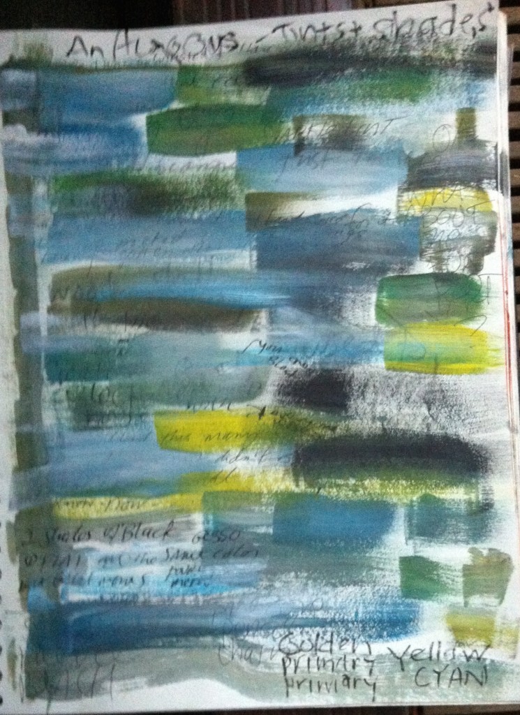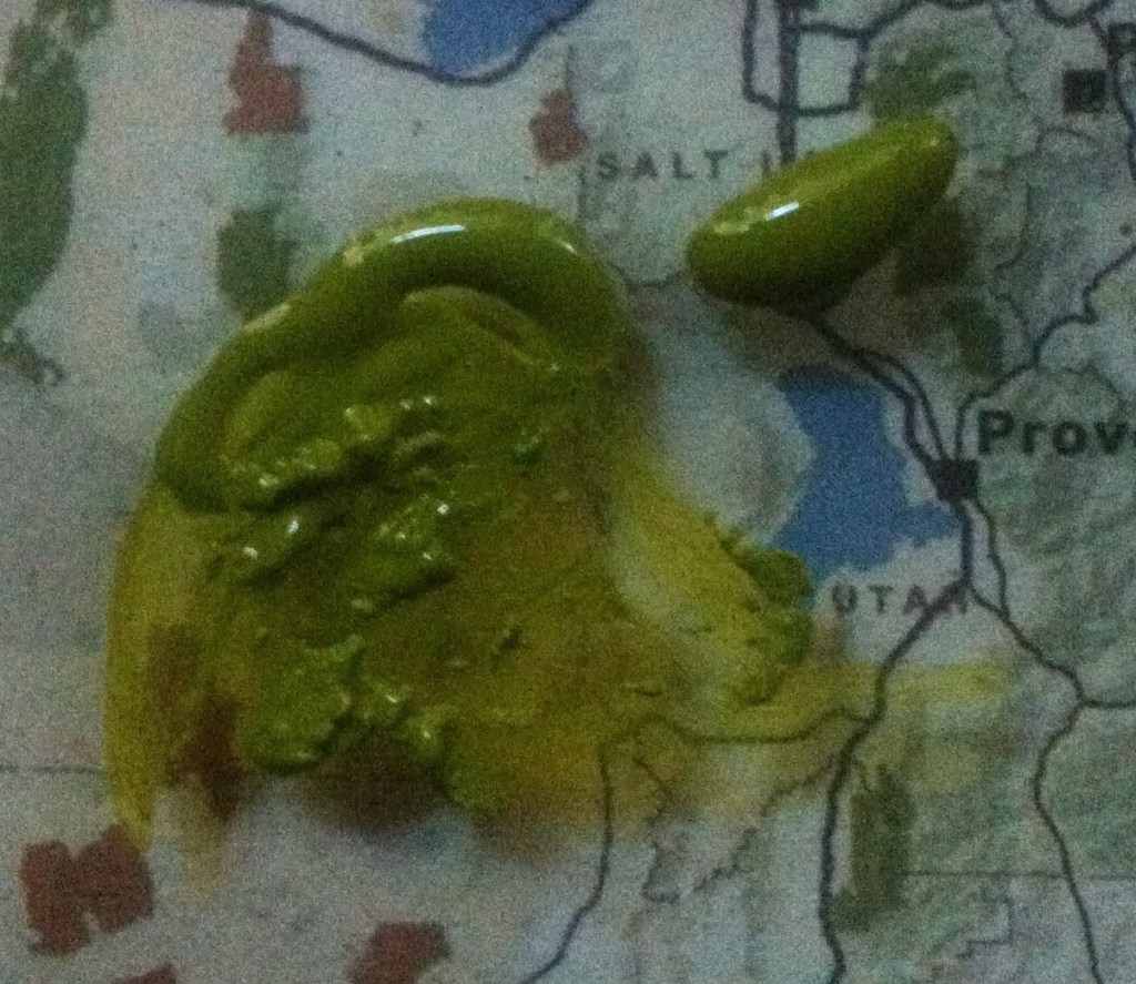 That afternoon I was using Liquitex chromium oxide green that I had earlier transferred to a jar, and thinned with medium and a bit of local spring water (w/ iron and who knows what else!). The paint in the jar was creamy consistency, but when I put my wet brush in it, the paint on the brush came away clotted, like miniature cottage cheese curds.