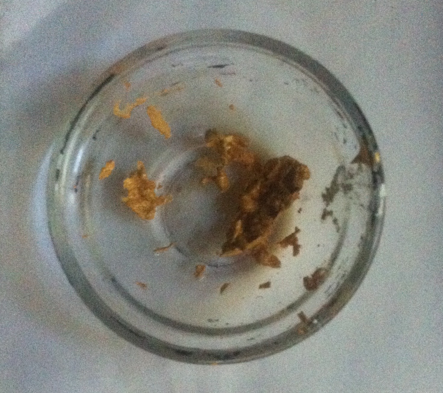 I am trying to paint without brushes –or painting the clumps out with a stiff brush, as in painting on bare wood which I did last night. In the case of the gold paint suddenly skinning over – no. After a few minutes exposed to air, mixing turned it to a strange solid mass without any sticking power.