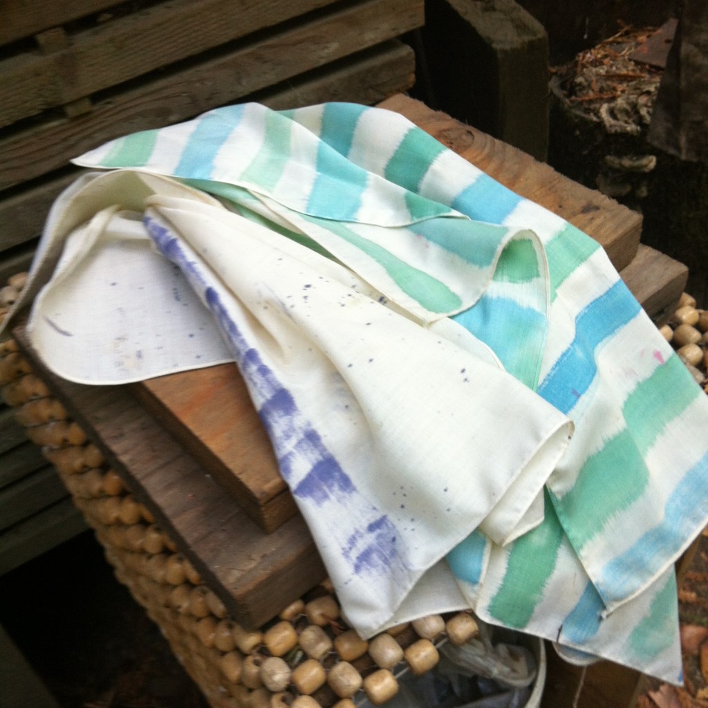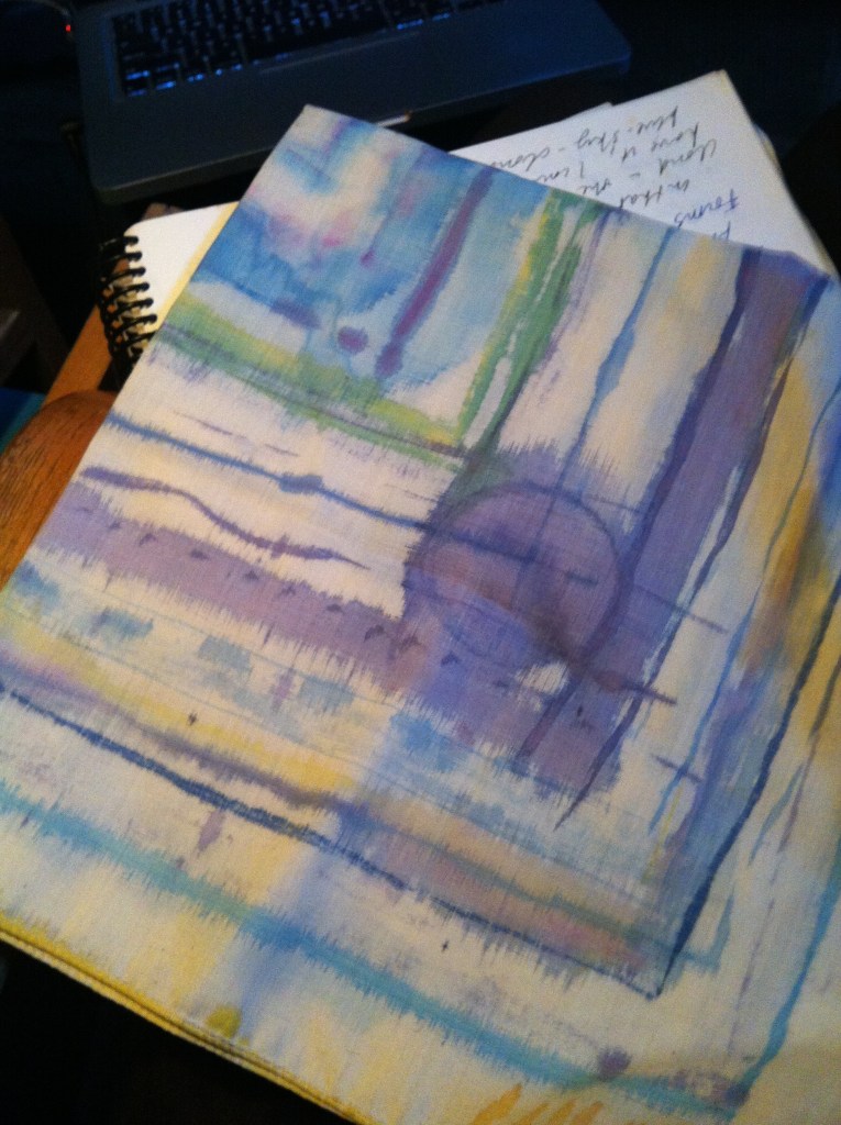 I inherited a stack of ecru dinner napkins, and last year was playing with acrylic inks. They are so absorbent it is hard to lay down a brush stroke. Maybe they need to be damp. Hmm, that can be arranged. I used flow-aid in places, and some folding and transfer.