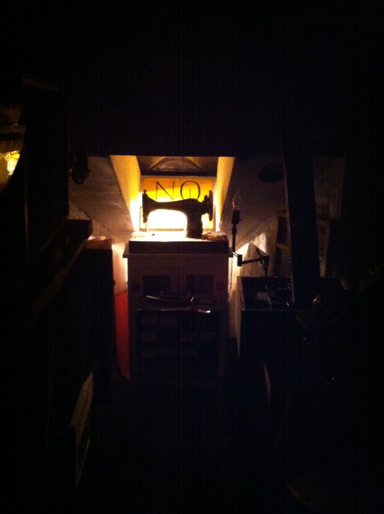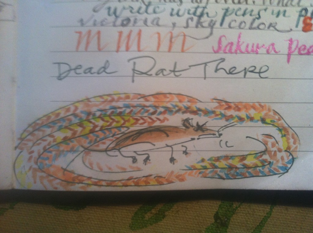Creative expression- a giant wood pile we converted to a sunny 9.5×10.5′ “patio”, two folding adirondack chairs I found on the street and painted, a rusty sewing machine I wired as a night light; a balsa wood model Spitfire I got from a gardening client, a sketch of a big rat the cat left for us; and my new blue blockers.