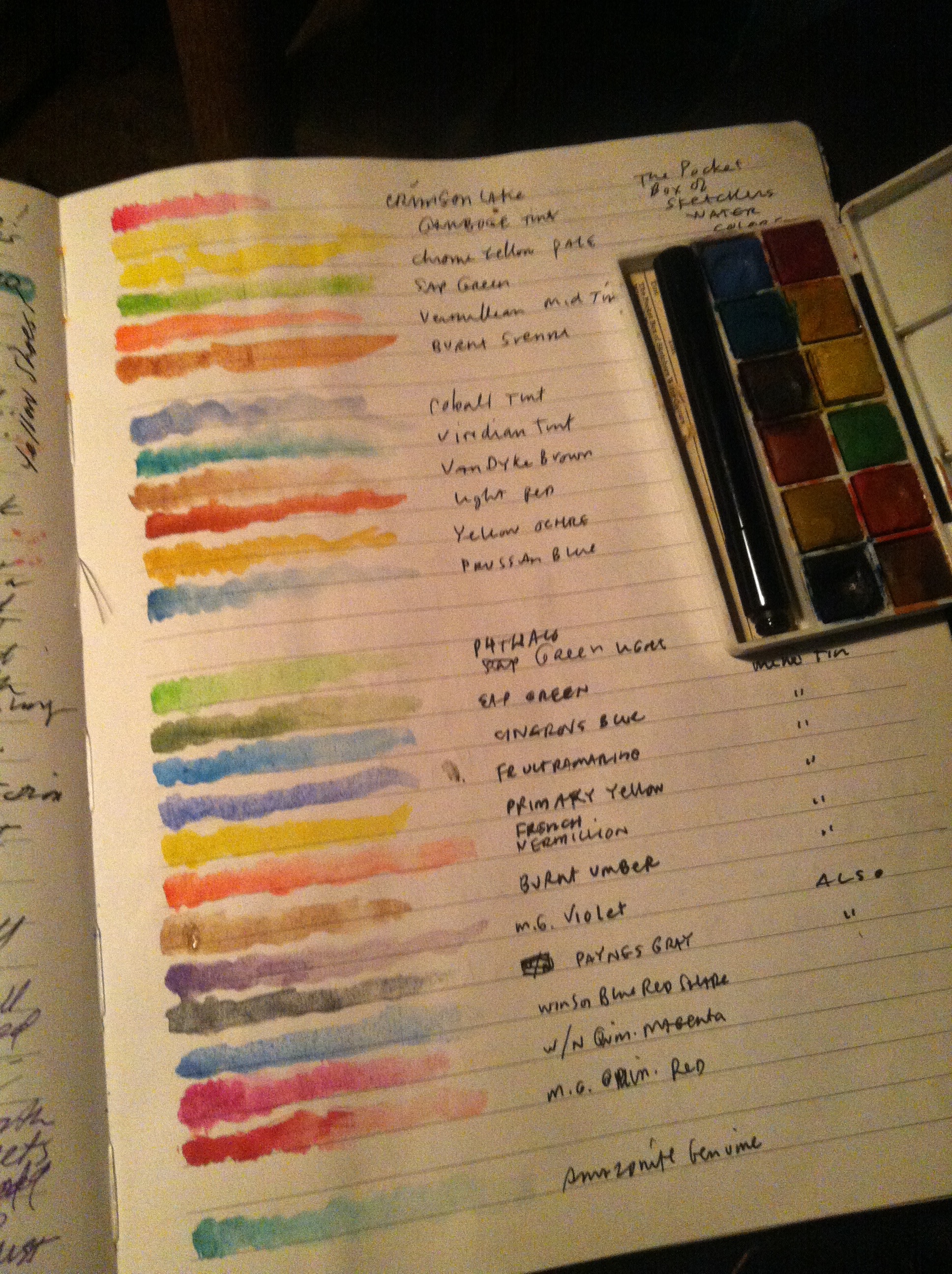 Brushes, paints, pastels, pencils, drafting and calligraphy supplies, the Winsor-Newton tin and Kolinsky brushes I bought for college in 1984 . . . journals, sketchbooks, etc. in different formats. Slightly-used oddities passed on to me over the years—I learned early the difference between quality and crap, to my own creative detriment.