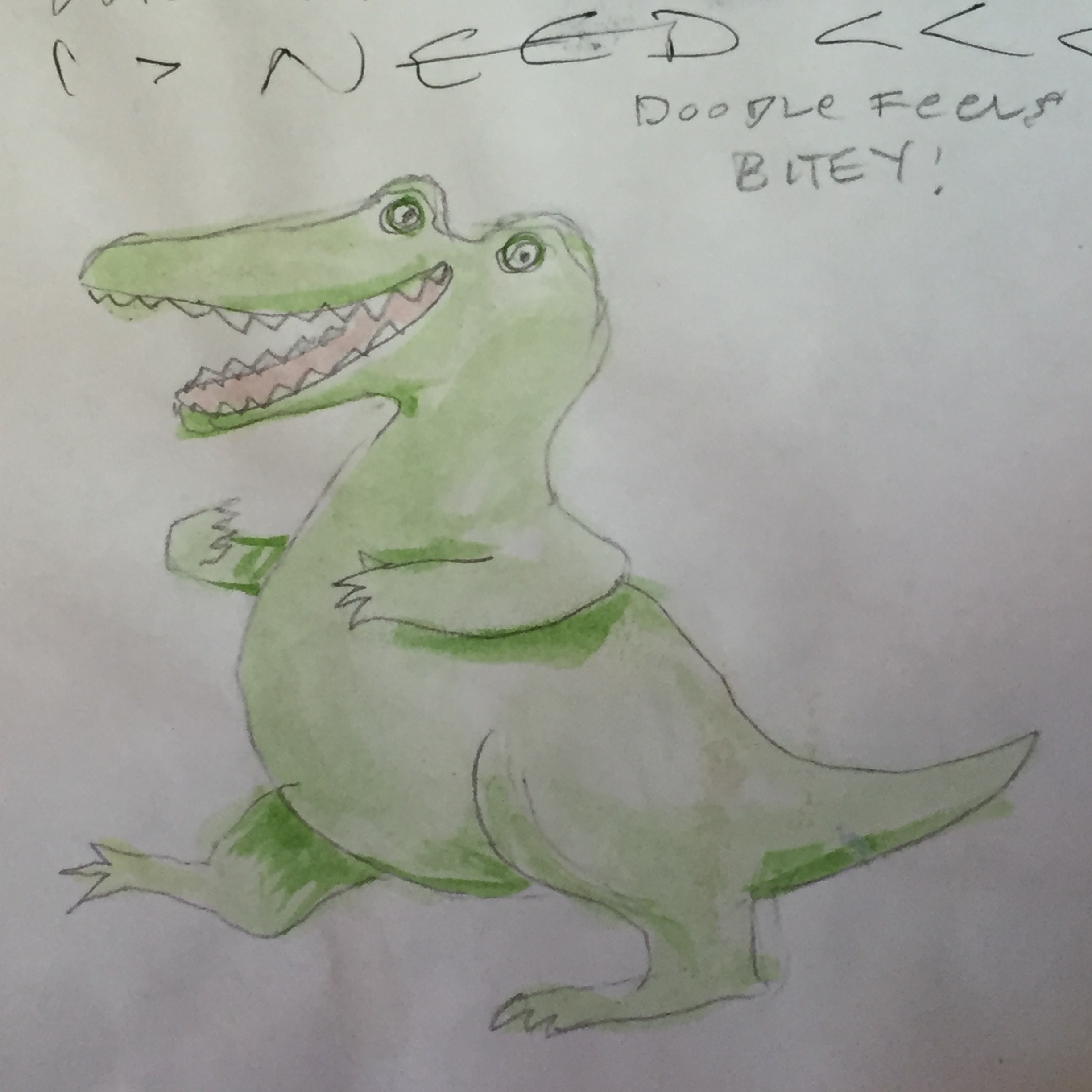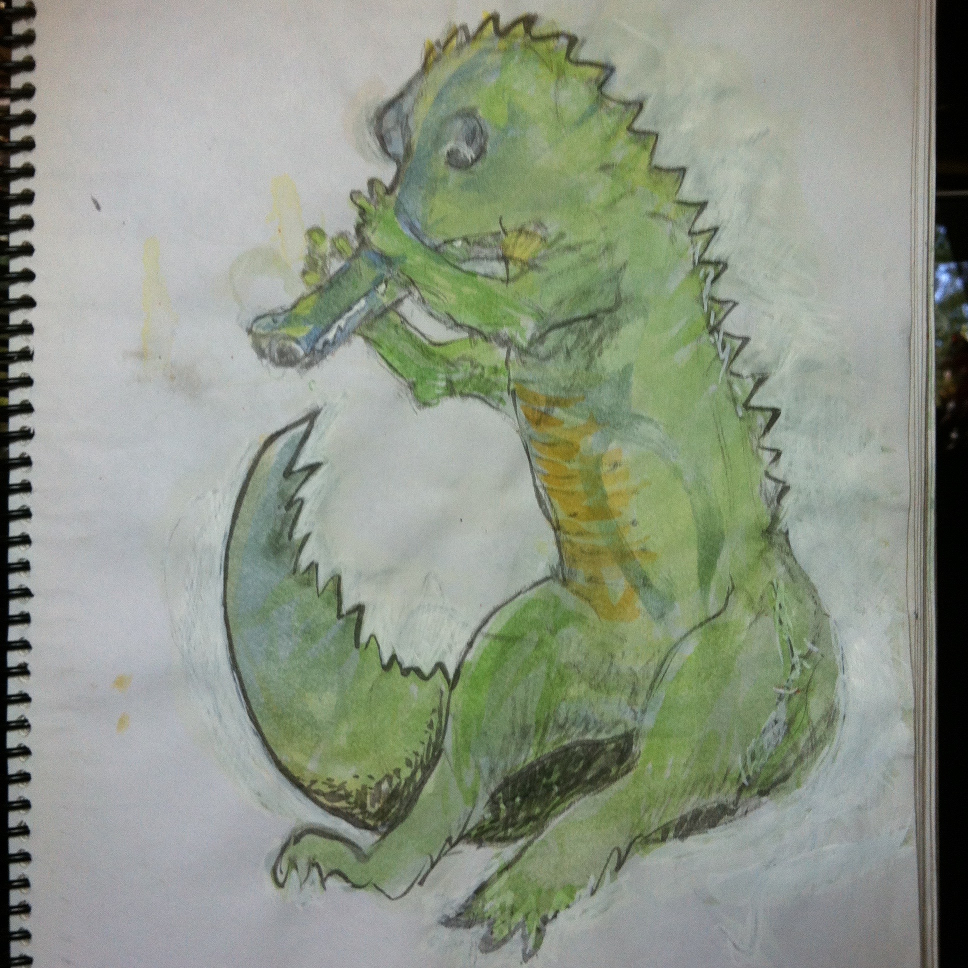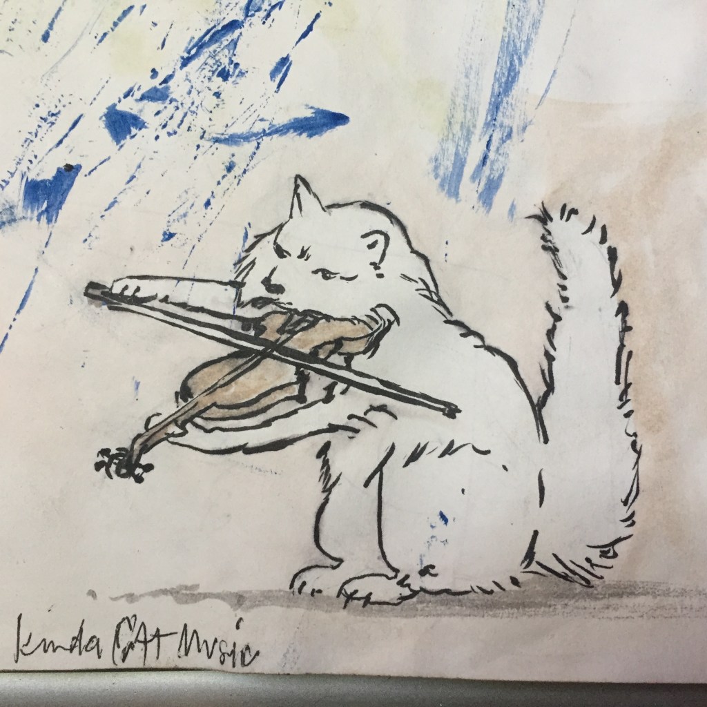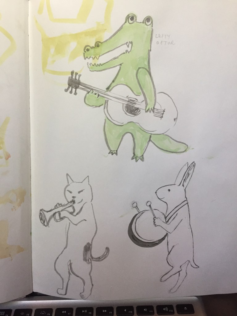 My Instructor KW suggested the Brementown Stuffies should play instruments, so I drew up Alliger pretending to trumpet like a cartoon elephant, and added watercolor, brush pen, white signo pen.