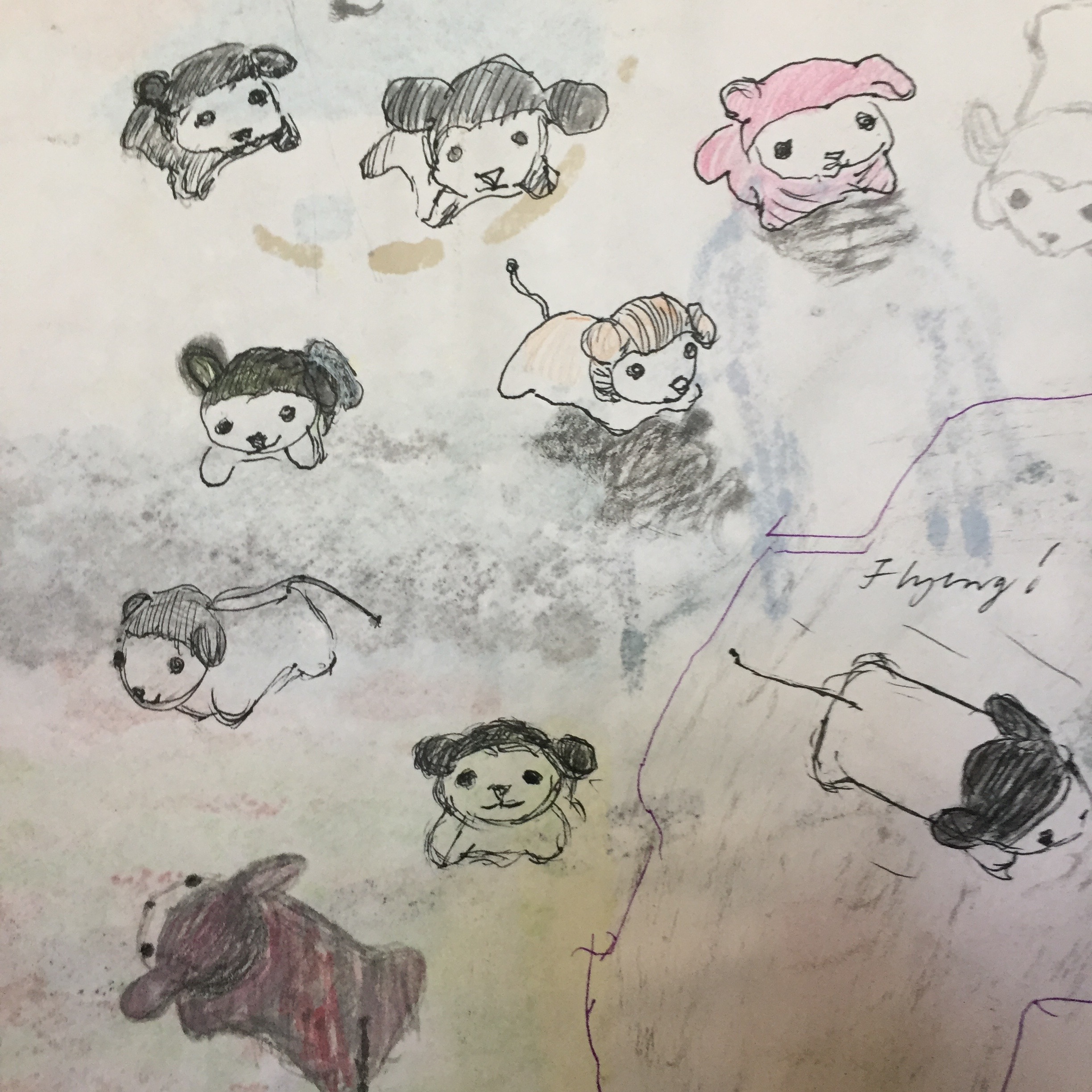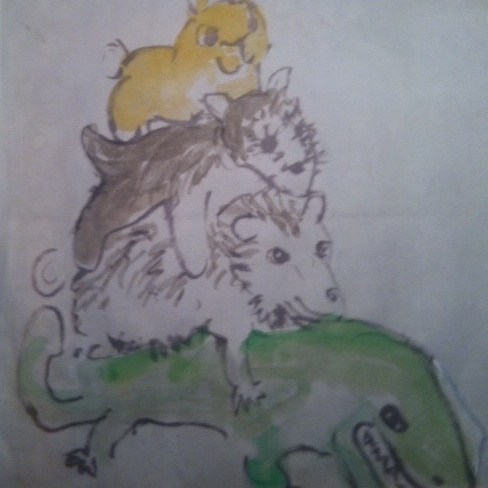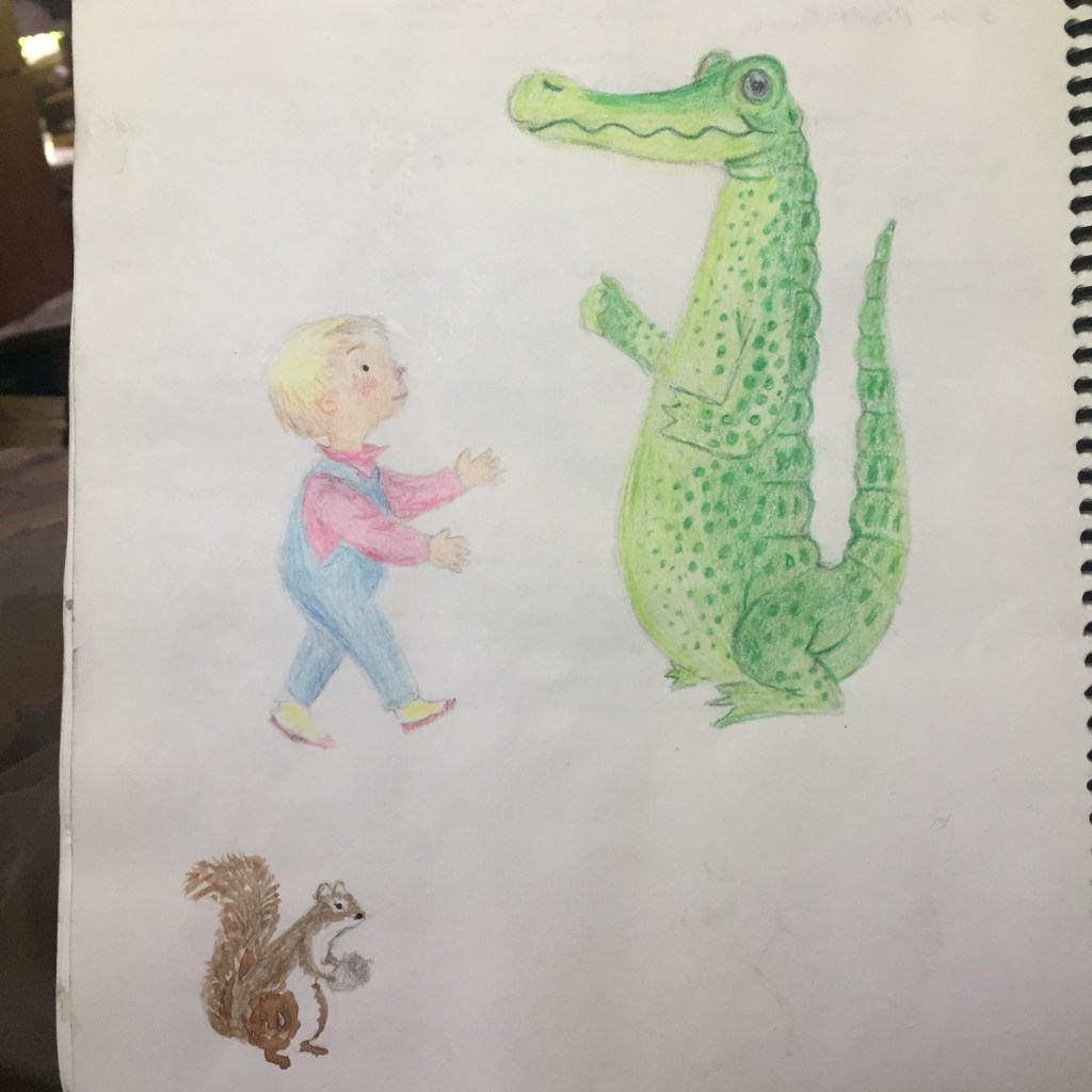 I have a number of online classes I signed up for and not done much with. There is one that I have found approachable because the instructor’s demeanor is approachable, mild, funny, not at all intimidating . . . creating animal characters for storybooks. I have some critters around that I am drawing- little bigfoot, my stuffed animals as the Brementown Musicians, and some random animals around the studio.
