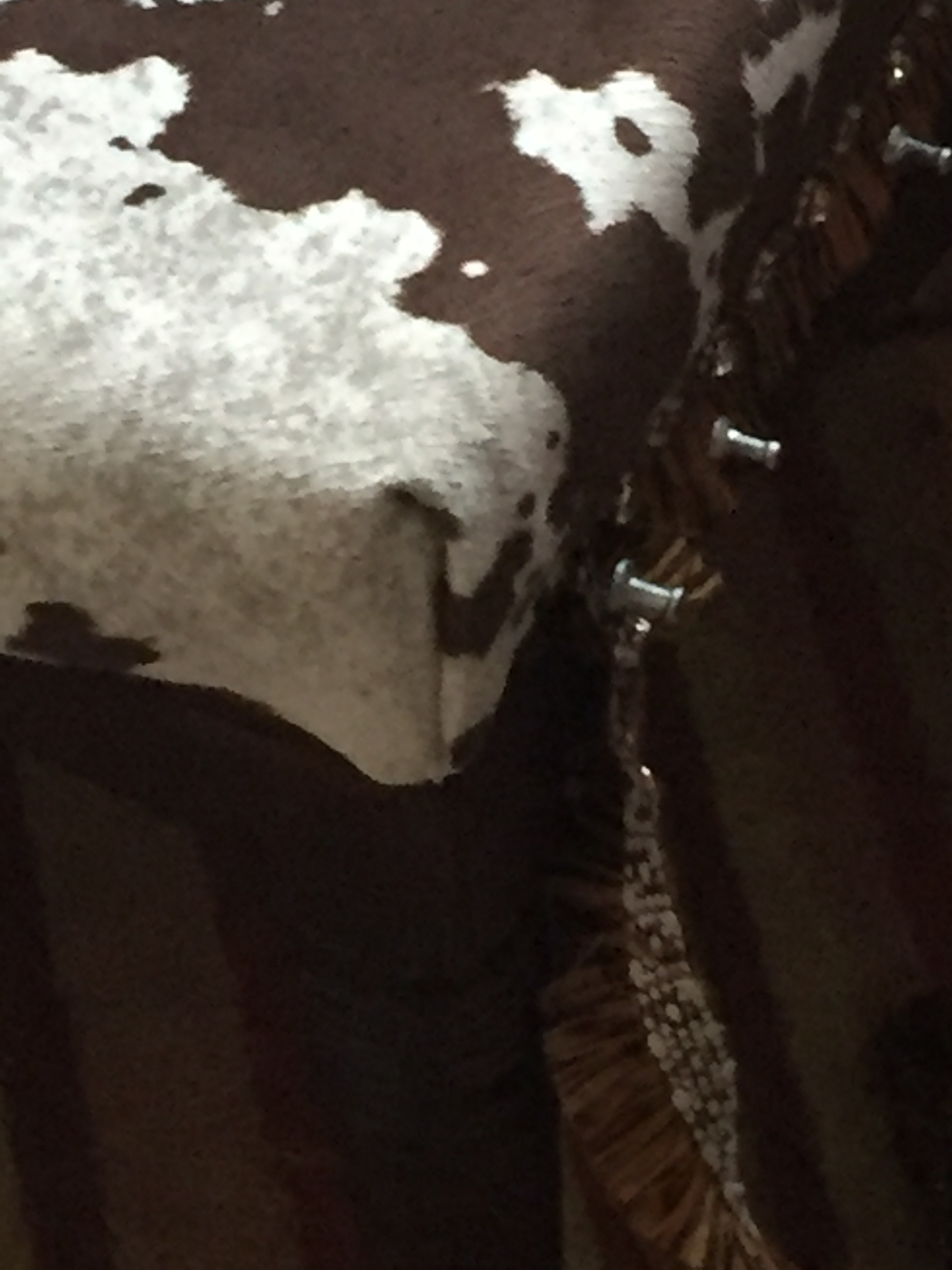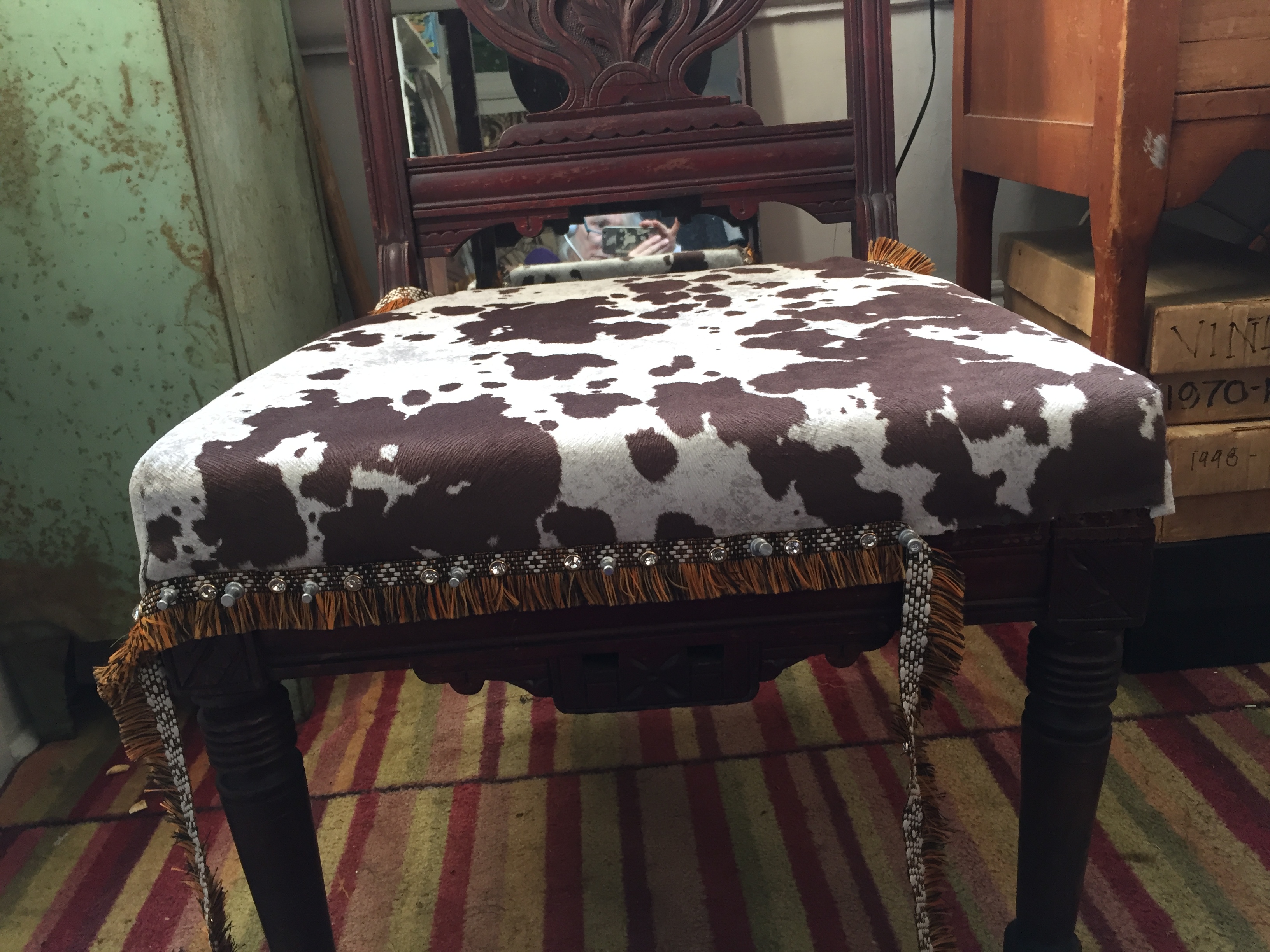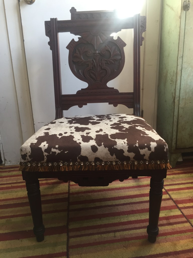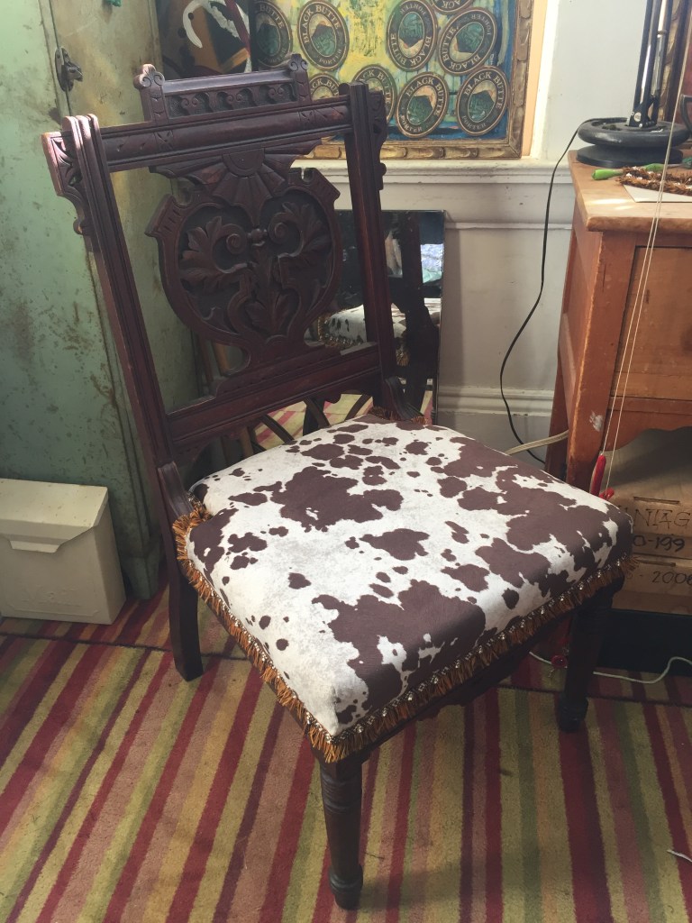 I found this OLD chair on the sidewalk, had to have it. It is the same era and style as the Eastlake hardware in the 1900 house I live in. I had to pull out about 200 tacks, stuffing, ragged fabric, 6 iron springs in a metal frame, to get down to the wood. There was a badly repaired crack which I couldn’t extract the nails from, so I glued and clamped it, and hope it holds. Thanks, Art, for cutting the thin plywood for the seat, snapped into place, and just the right amount of flex. This fake Holstein fabric probably cost as much as an actual cow skin, and the fringe . . . Crazy fun project. I am really satisfied and happy at how it turned out.
