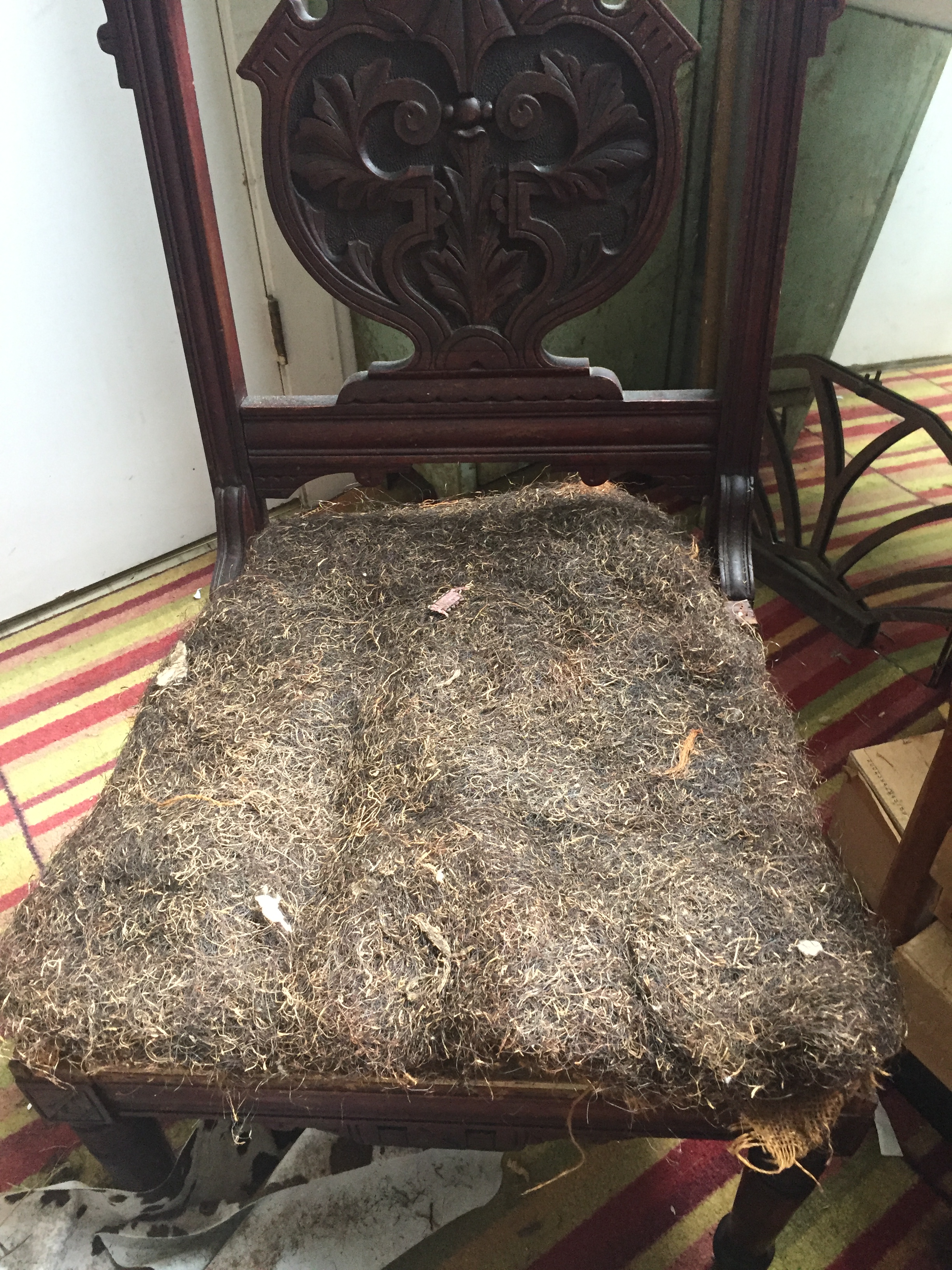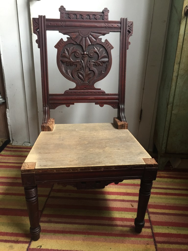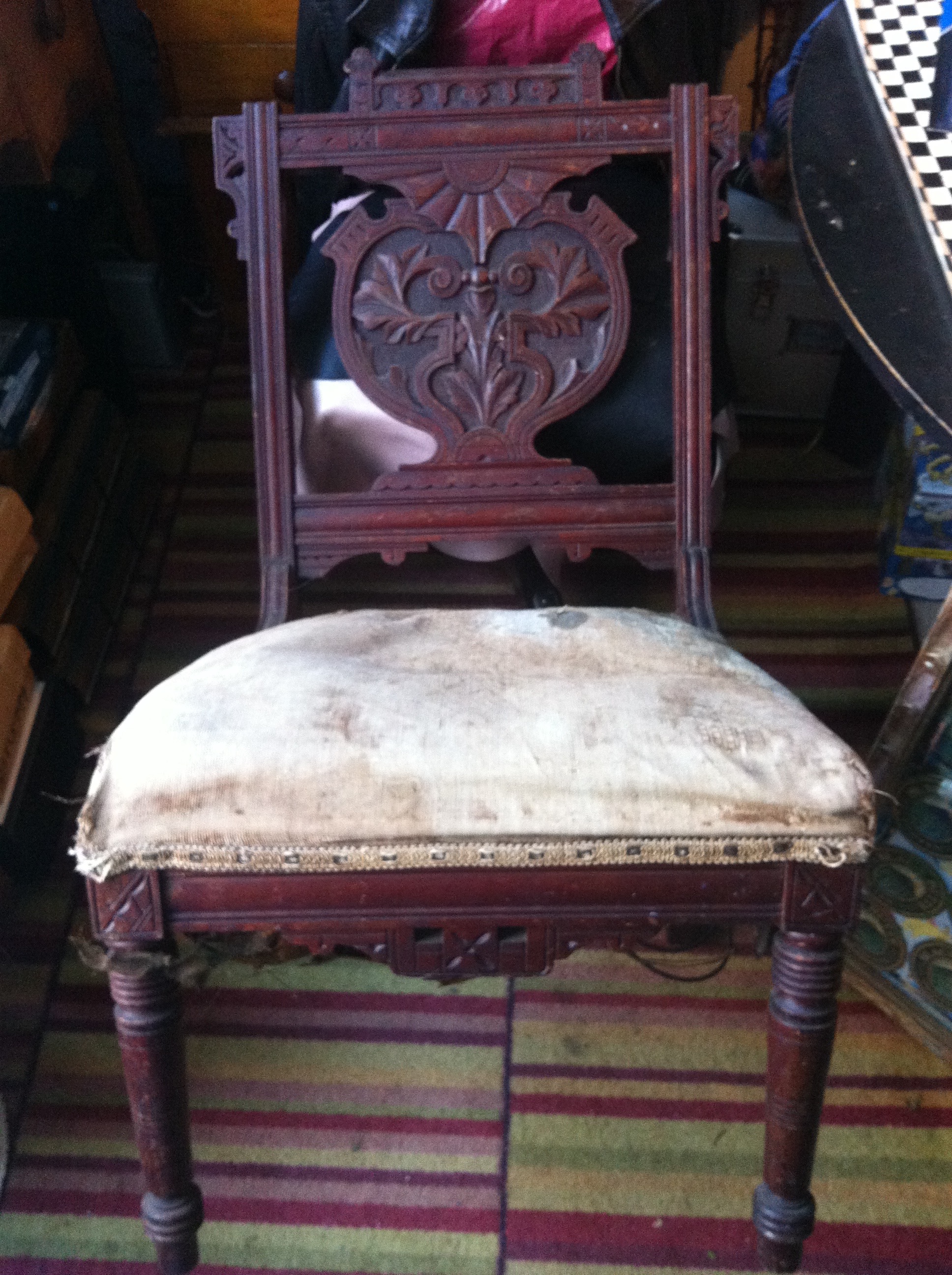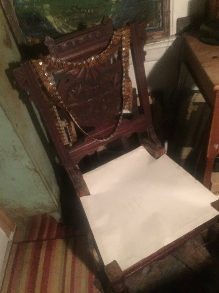 I found this OLD chair on the sidewalk, had to have it. It is the same era and style as the Eastlake hardware in the 1900 house I live in. I had to pull out about 200 tacks, stuffing, ragged fabric, 6 iron springs in a metal frame, to get down to the wood. There was a badly repaired crack which I couldn’t extract the nails from, so I glued and clamped it, and hope it holds. Thanks, Art, for cutting the thin plywood for the seat, snapped into place, and just the right amount of flex. This fake Holstein fabric probably cost as much as an actual cow skin, and the fringe . . . Crazy fun project. I am really satisfied and happy at how it turned out.