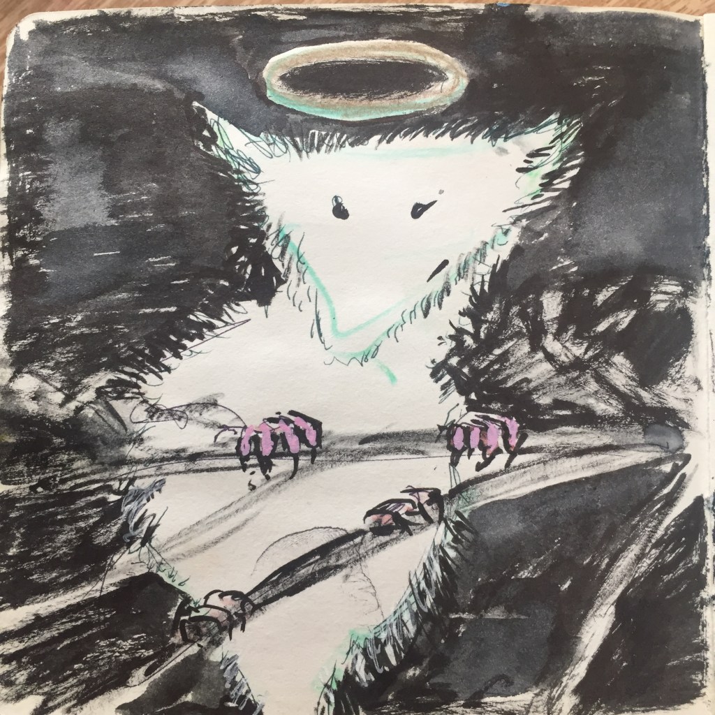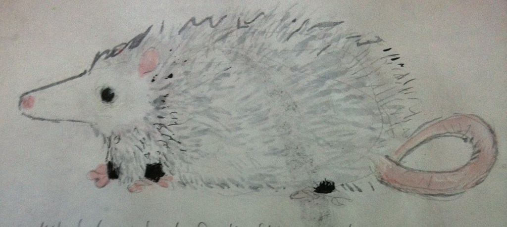 Here is a portrait i painted of the new birthday possum I ordered from Mr. Mopps and had Art go to town to pick up–taking umbrage at being asked to play an instruments for Brementown. We are singers, he say, mistranslation.