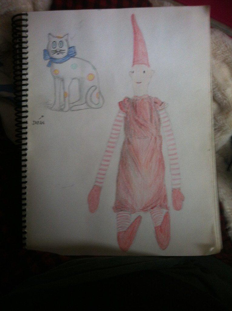 I asked Mimi for some toys to draw, so she put them all over my bed. I drew the Japanese porcelain cat, the longy-leggy doll, and the bendy frog with Derwent watercolor pencils, in the messy, wrinkly, spiral bound sketchbook. So fun to draw in..