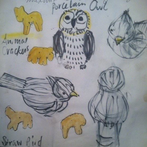 Suddenly I was incapacitated with “a bad sprain” and there was nowhere else to go. Scrounging through half-used sketchbooks for ideas and empty pages to fill, nibbling around the classes with no real plan, nuthin else to do but draw little toy animals from around my bed . . . now every day something appears on a page–even in this super-scrappy old sketchbook.