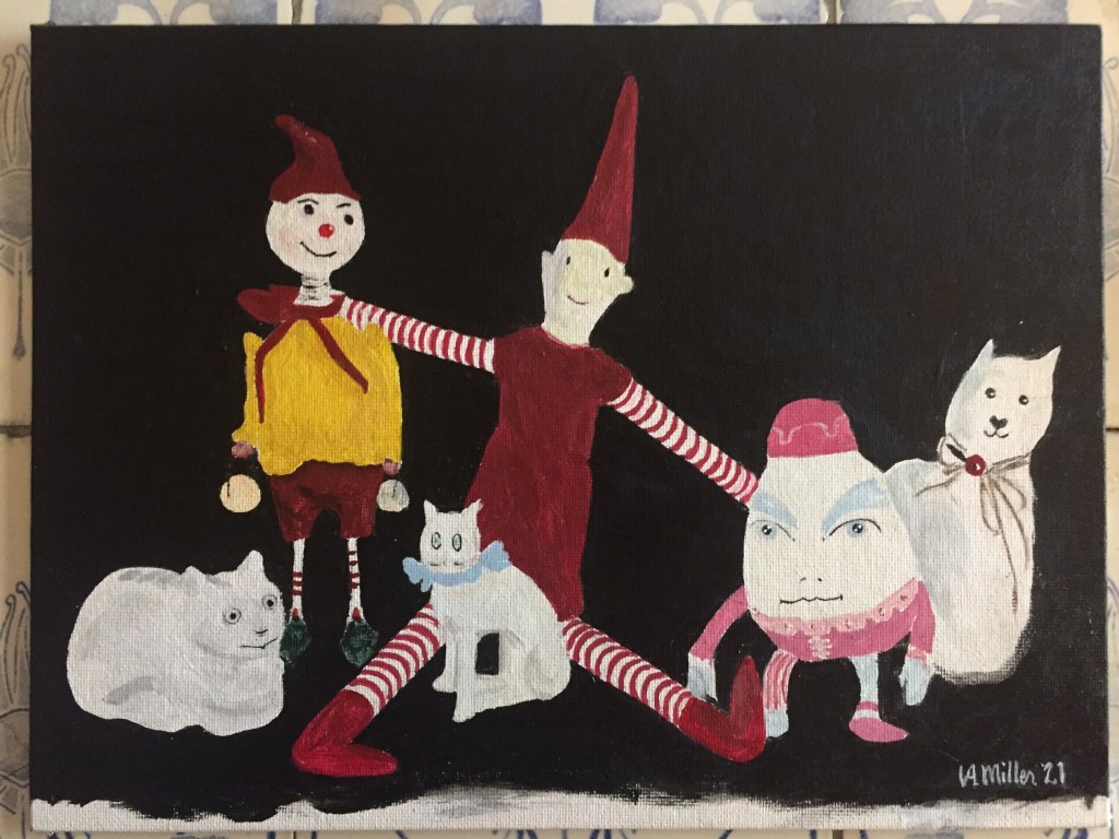 Mimi’s toys, thrift store acrylic paints on 9″x12″ canvas panel