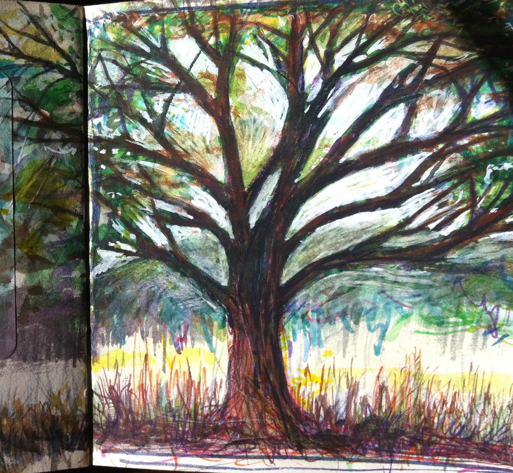Years ago — I remember Clamity Jen handing me the sticker on the page that says XXXV, so that is the year 2000 — I started a drawing of the big oak tree at the Browns Valley Aerodrome campground, site of the not-quite yearly Memorial Day weekend music party known as Meadow Muffin.. Layers later, it is finally done. Trees are hard! Until you know how.