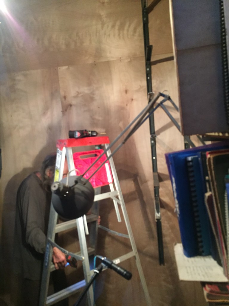 Art had the Jobbox moved out of the cabin into the woodshed, and it took him a week to insulate the music room and put up some pretty plywood panels. We plan to hang guitars and banjos and Ukuleles, and tuck accordions under a work bench. We found two bar stools on the street here that will help make the room more visitor-friendly. We head back tomorrow.