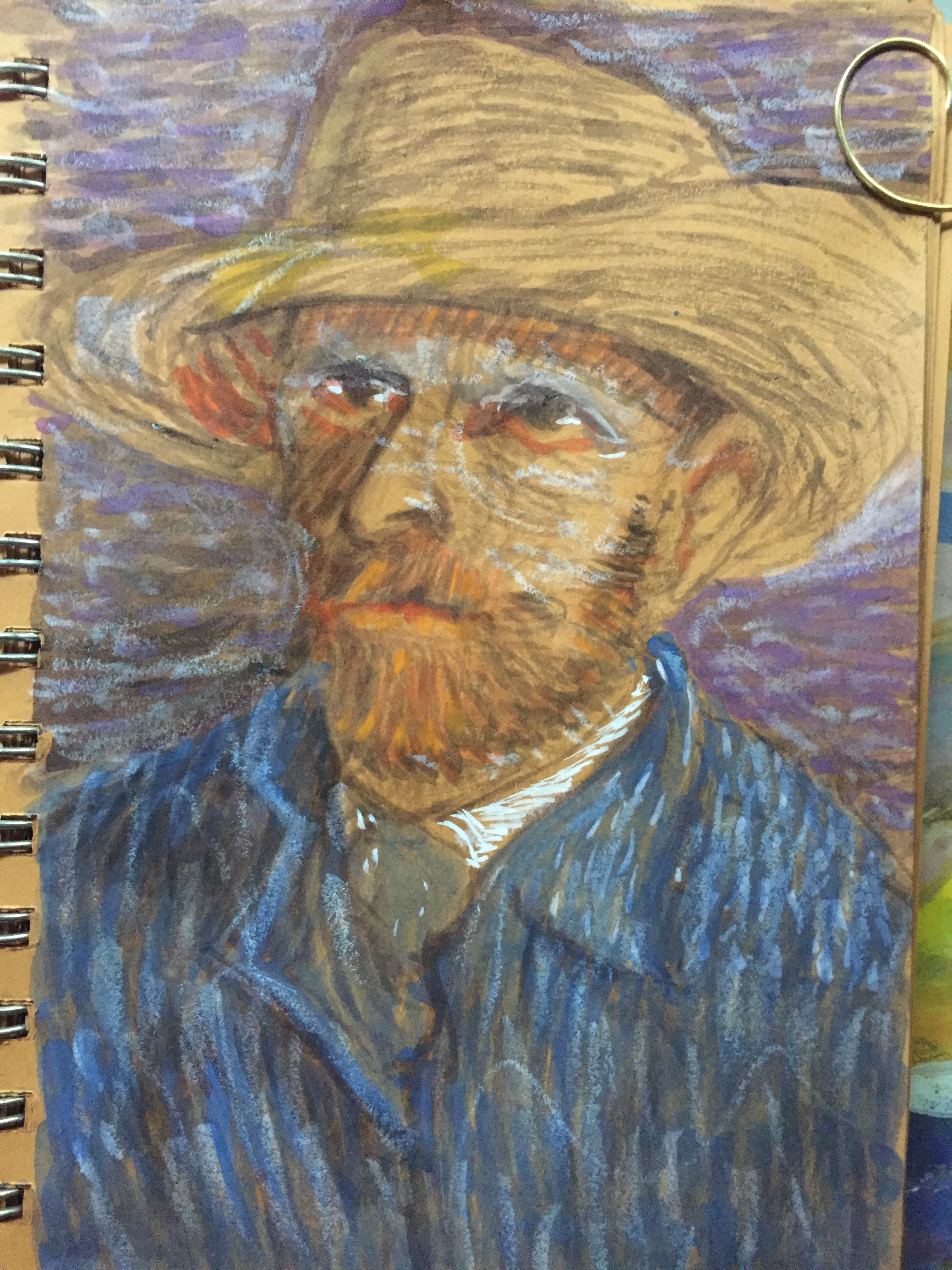 By the way, we just watched At Eternity’s Gate, really excellent movie about Van Gogh. I have always been a huge fan, since he knocked the wind out of me at the Chicago Art Museum. I did this little copy from an old datebook I have from the 1980’s where there is one of his paintings for each week. Not so much thinking of portraits here as just copying his brush work, but there it is.