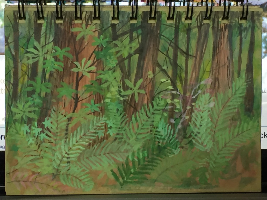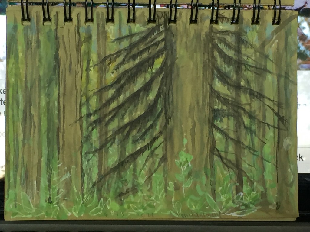 In mid-June I sketched little copies of 2 paintings by Andie Thrams, using watercolor, white gouache, and color pencil on olive paper. These shots from my bed in morning light, with the refurbished-iPhone 6 camera.
