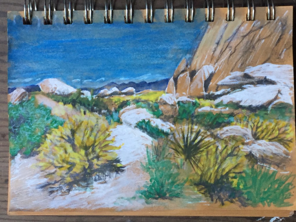 Haven’t been to the desert in such a long time, I decided to copy a postcard from Mojave National Preserve using caran d’ache watercolor pencils and white Posca pen on mustard sketch paper. I used a waterbrush with a water-black ink mix, pulling dark blue shadow lines from inside the tangles of rocks, cholla, junipers and sage. The photograph loses some of the subtlety of the yucca leaves and shadows.