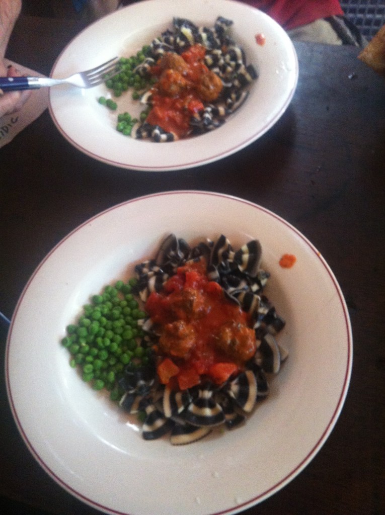 more experiments with color- my special simple meatballs and zebra farfalle. the original vodka cream sauce was much more orange, but then I added a can of diced tomatoes. The peas make it, tho.