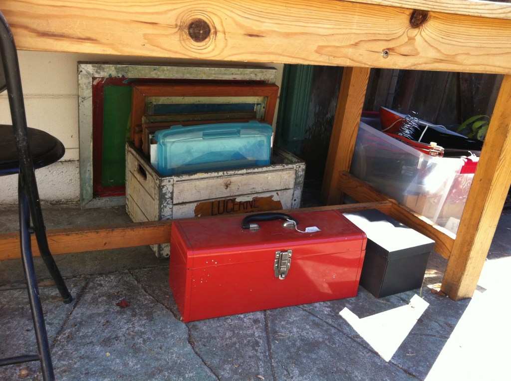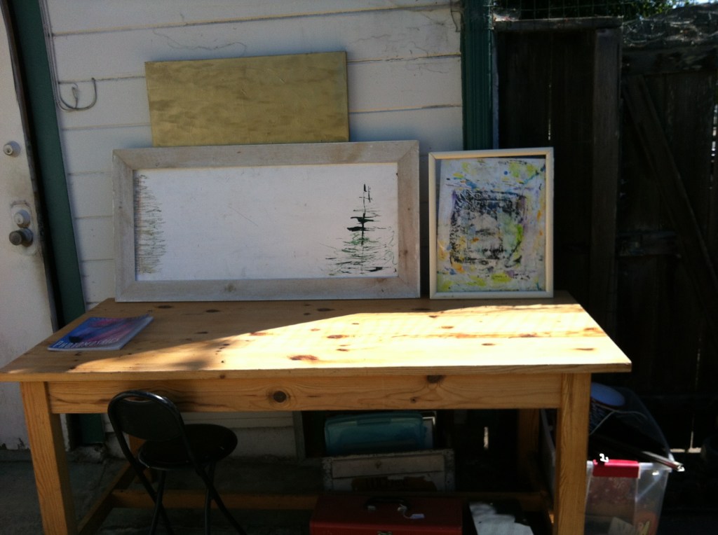 So, really, am I BEING AN ARTIST, or just Doin Stuff, and what difference does it make, except–what to do with all the physical Product, weird format frames and glass that are not fitting together, my actual Clean worktable outside by the trash bins. I am seriously addressing what all this stuff is really for, and why I have it- It’s so uncertain, but sorta fun.