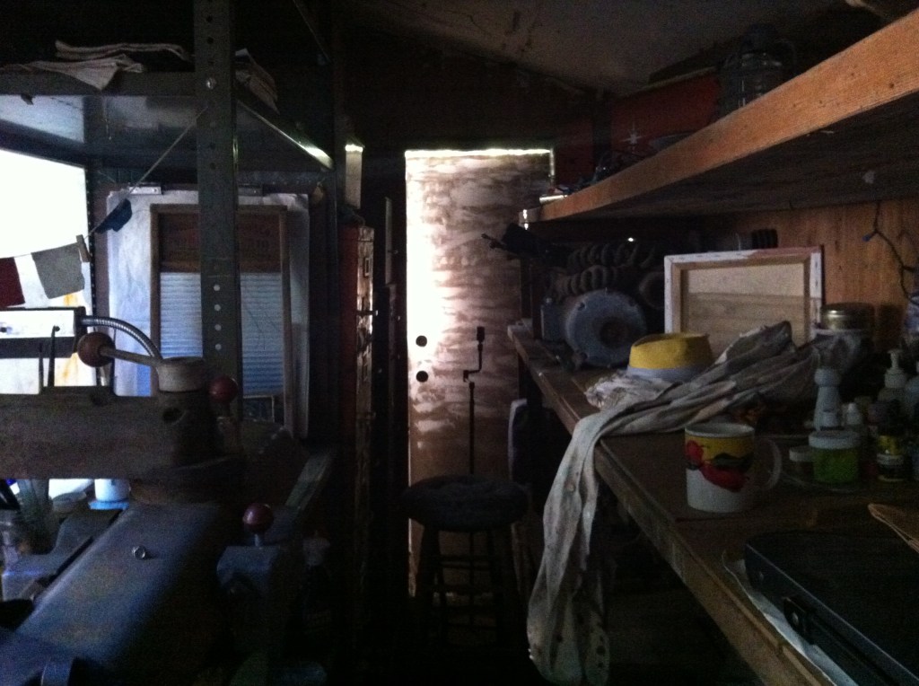 We reconfigured some of the shelving to make a long tall work bench, and have developed a fantasy of installing the 58″ square sectioned french window we bought for the house-that-became-a-deck. It would be nice to have some natural light, and a reading chair back there–maybe next year.