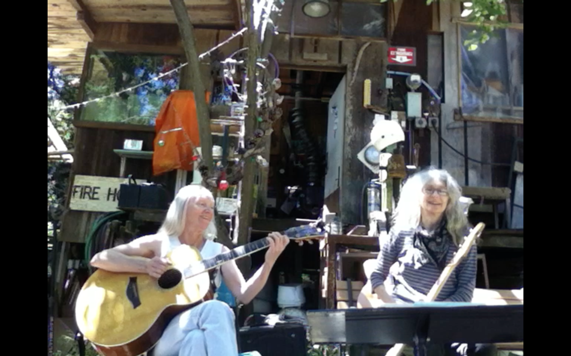 Gomer and Tara came to Canyon last Sunday to join in a live facebook event, and luckily I was unable to bypass my three Apple devices’ security filters to broadcast. We ended up with six delightful–to me, anyway–recordings that I was able to post later. Had it been live, considering the difficulties, it would have been worse than unwatchable. My hair was clean and fluffy, the weather sublime, Art’s wacky shack a perfect backdrop–plastic window and all. I was in fine voice, and did a song of Tara’s, sans bass, that I barely knew: Twilight Moonrise. She did Love of a Good Cat. Gomer was the grip and tech advisor, and positioned my iPhone behind the Woodstock wood stove, cutting off our legs. The quality of the iPhone 4 voice recording was astonishing.