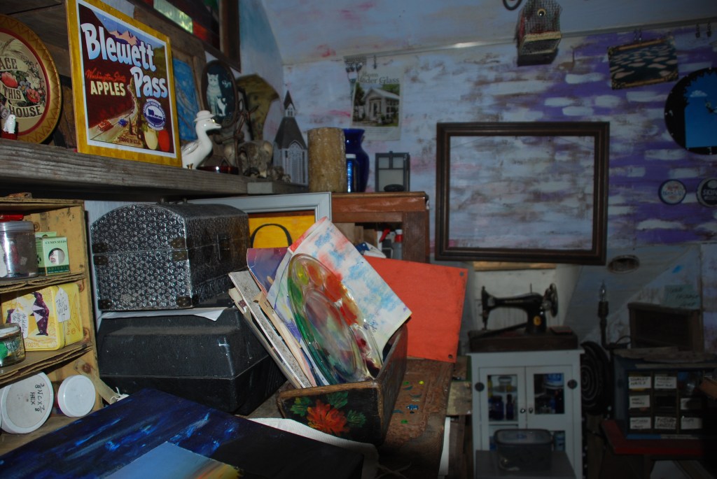 I had hallucinated a space in her giant garage where I had stored my camping gear and toys after Steve’s death–but it is full of another malingerer’s massive mouldering pile of god-knows-what . . A realization came that the lovely dark knotty-pine room was not really Available, either. Over a few visits I was able to tuck one table, easel, the frames, canvases and framing tools indoors, but I felt all at sea.