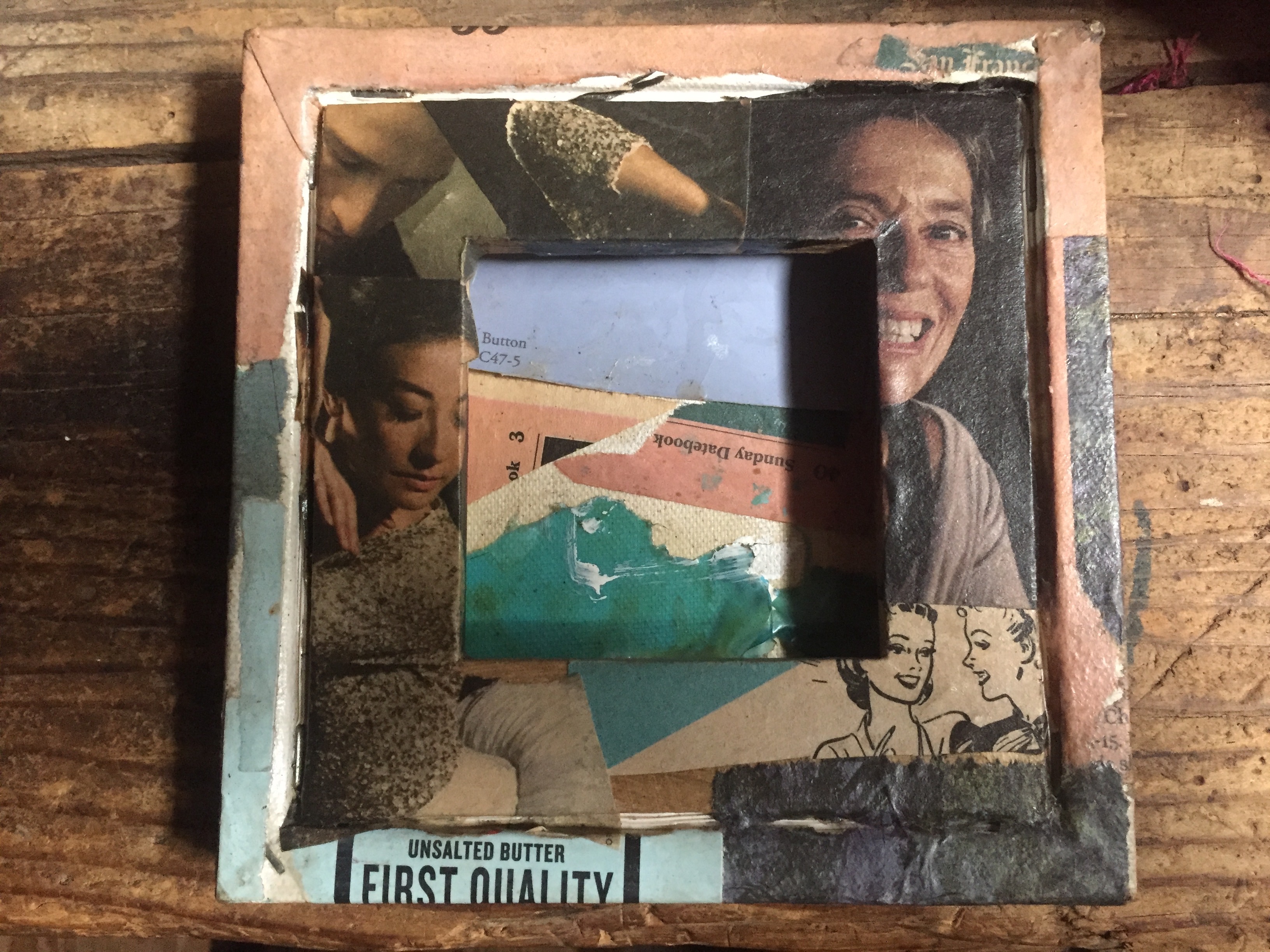 Not sure where little canvasses came from. A gift? A free box? An actual store? Scraps of recycling, Sunday newspaper, the Pink Section of the San Francisco Chronicle, matte medium, gold paint, pondering, serendipity.