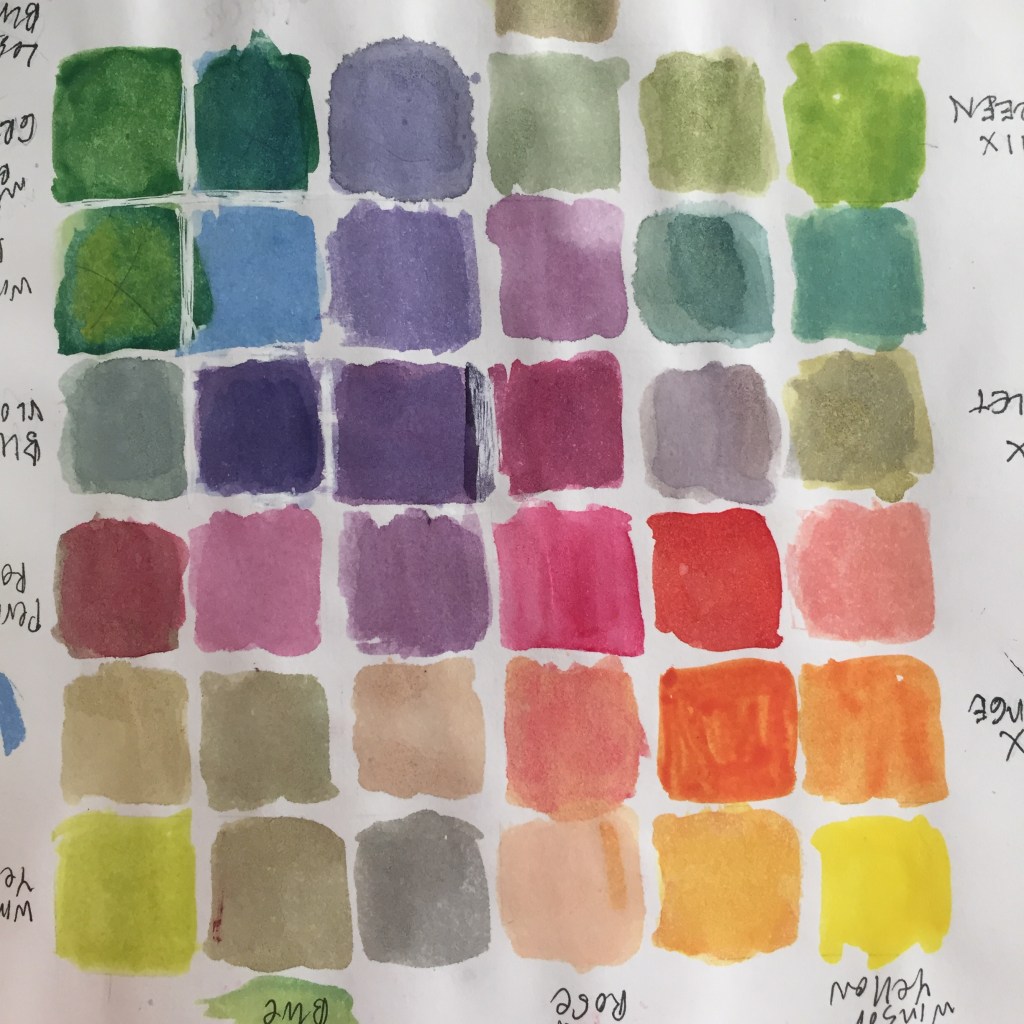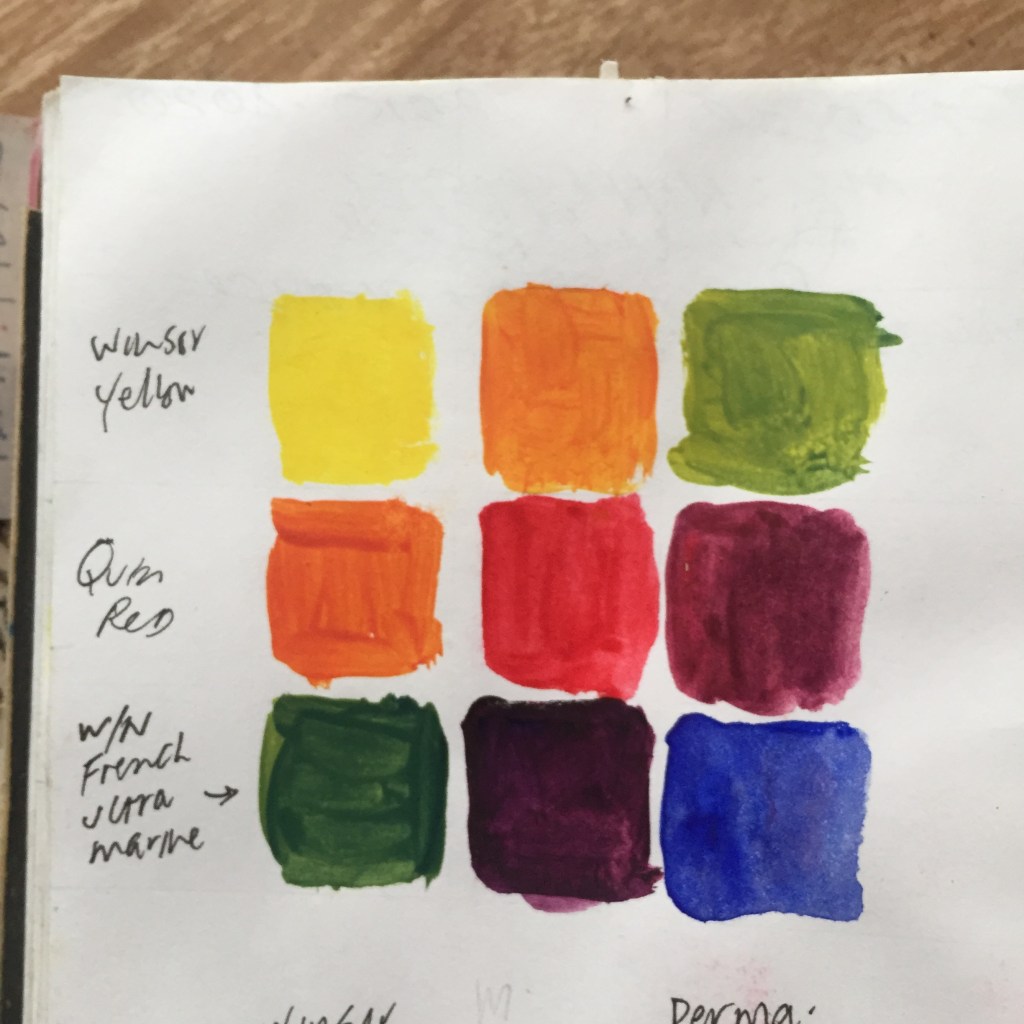 Winsor Yellow, M. Graham Quinacridone Red, French Ultramarine, on the diagonal. Initial and secondary mixes.