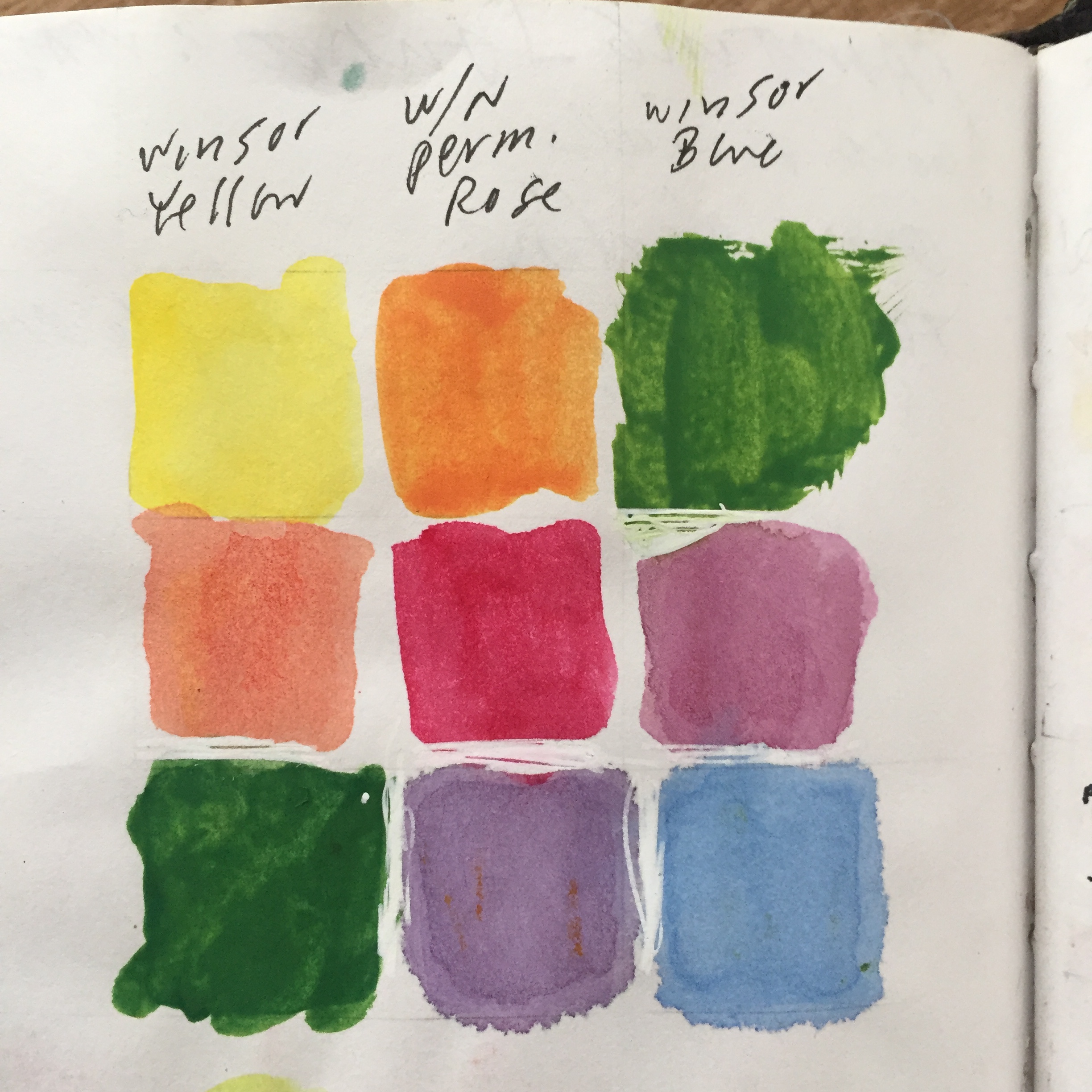 Alternately, Winsor Yellow, Permanent Rose, Winsor Blue, oddly less saturated, pastel results. Lovely.